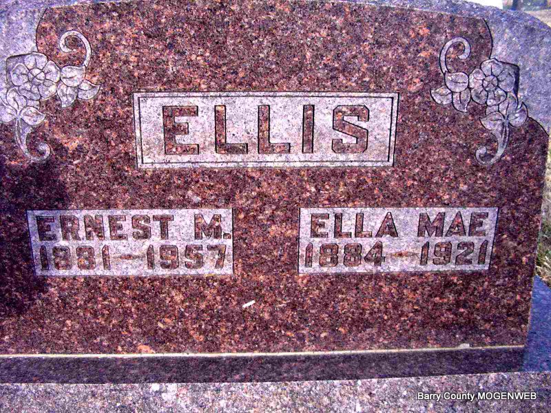 SSW: Harret Emeline Ellis - Inscription: "In God We Trust", "Father And Mother Rest In Peace." Has engraving of a Bible on stone. - Research Note: His wife was Harriet E. Ellis. Parents not known on the death certificate. Abby Ellis of Monett, MO was the informant. Jim's note: I am puzzled by the given name Ezearul on the stone. In all the census records his name is shown as Ezekial, except for 1880, when he is registered as E. Z. Ellis. E. Z. Ellis is also the name on his death certificate. Is the inscription on the stone a mistake? Ezekial Z. Ellis was the son of Benjamin Abbott Ellis and Mary Anna Maples, who were married in McMinn County, TN., Aug. 7, 1848. According to census records they came to Missouri between 1860 and 1870. E. Z. Ellis's death certificate gives his birth place as Barry County, MO., but I would feel certain that he was born in McMinn County, since the family is recorded in the census there in 1860, when he is shown to be six years old. He married Harriett Emeline Calton Sept. 19, 1875, in Barry County, and they were parents of seven children according to census records. - Story by Sylvia: Uncle Zeke was Ezekiel Ellis, the son of Benjamin Abbott Ellis and his wife Harriet Emmaline "Aunt Liney" (Calton) Ellis. I have pictures of them somewhere. They lived in Monett Missouri having come from Tennessee and Alabama. Liney was hard of hearing and Zeke and she were very "countrified" and unsophisticated. There is a family story of Zeke, having been invited to a friend's home who had electricity. He was 'caught short' during the visit and had to visit the restroom. He was told "To turn the bathroom light on, just pull the chain." He apparently went in and did so. Conversation went on without him for a while, but eventually the people noticed that Zeke had not emerged from the bathroom for quite some time! Finally the owner of the home investigated and found Zeke, still in the room, muttering and cussing under his breath. Subsequent investigation found that Ezekiel Ellis had never before SEEN a pull chain type light and he was trying to turn it off by pushing the chain back INTO the fixture! Quite reasonably, he had figured that if you pull the chain to turn it on, you had to push it back to turn the light off. | Headstone J. T. Mayes Death Certificate Note Phyllis Long Census TN Marriage Index MO Marriage Records Jim L. Wilson Story Sylvia Stevens Photo Jay Trace |