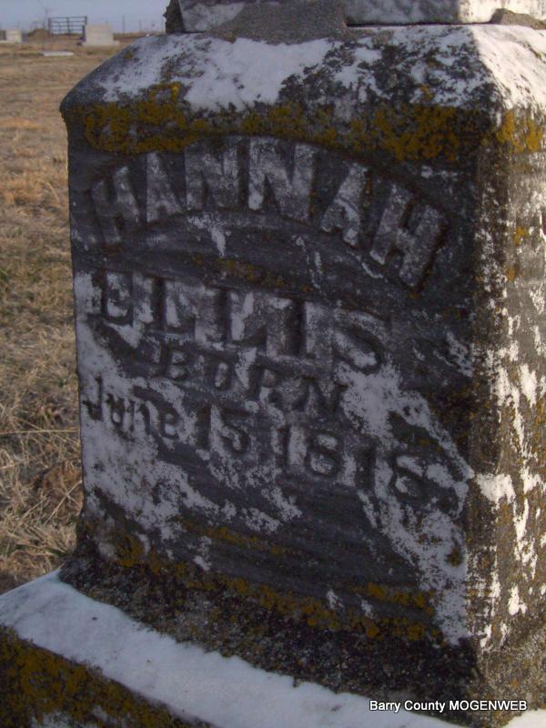 SSW: John M. - Research Note: Hannah (Maples) Ellis was the daughter of Josiah Maples and Mary Ann Dyer, who were married Sept. 16, 1807 in Grainger Co.,TN. Hannah was probably born in Sevier Co., TN. She married John Mackey Ellis, Dec. 21, 1842 in McMinn Co., TN. In 1850 Hannah and John Ellis resided in Division 26, Bradley Co., TN and in 1860 they lived in McDowell Township, Barry Co., MO. John Mackey Ellis was the son of Ezekial Ellis and Martha Ann "Peggy" Mackey, who were married Feb. 3, 1821 in Blount Co., AL. John and Hannah Ellis's children were: Mary Jane, Perry S., Francis A., Martha C., and Benjamin A. The date that I have for Hannah's death from family records is May 6, 1895. According to her husband's obituary, she was living when he died in 1892. | Headstone J. T. Mayes Family Files TN Marriage Index AL Marriage Index Jim L. Wilson Photo Jay Trace |