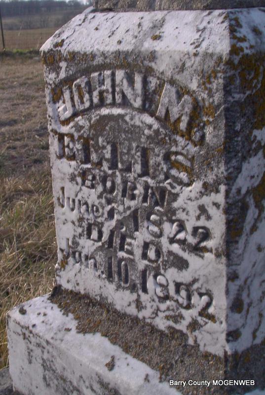 Research Note: John Mackey Ellis was a son of Ezekial Ellis and Margaret Ann "Peggy" Mackey. He married Hannah Maples Dec. 21, 1842 in McMinn County, TN. See notes for Hannah (Maples) Ellis. - Cassville Republican, Jan. 28, 1892 - Died Jan 10th, John M. Ellis, an old citizen of Ozark township, at his home in Clay Hill settlement. Mr. Ellis was known all over Southwest Missouri as old "Uncle John". He was born in McMinn Co., Tenn., (Jim Wilson has place of birth as AL.) June 3rd, 1833, and resided there until manhood, and was married to Hannah Maples whom he leaves to mourn his loss. He and his family moved to this state in the year 1852 and stopped in that part of Greene County now known as Christian, where they resided about eight years, then moved to Barry County where they have since resided. Uncle John raised five children, who are all residents of this county, three boys and two girls. He was converted to Christianity in his young days and has traveled that road ever since, being a prompt member of the Methodist Church until death. Uncle John never had an enemy on this earth that is known of. Just think of it, good people, how many of you today can say that you have not an enemy on this earth? Augusta. | Headstone J. T. Mayes Online Newspapers McMinn Co., TN and It's People Headstone Jim L. Wilson Online Obit Phyllis Long Photo Jay Trace |