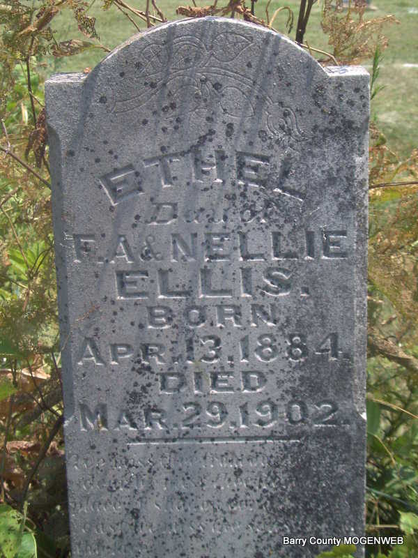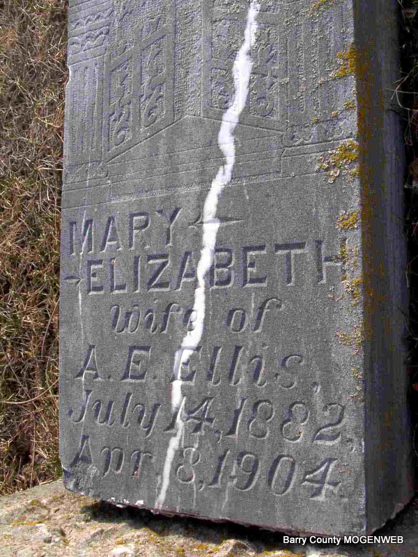 | ELLIS, Mary Elizabeth (BALDWIN) | July 14, 1882 | April 8, 1904 | Inscription: "Wife of A. E. Ellis" - Inscription: "At Rest" - Research Note: Albert E. Ellis, age 23, married Mary E. Baldwin, age 16, on Sept. 18, 1898 in Barry Co., MO. | Headstone J. T. Mayes MO Marriage Records Phyllis Long Photo Jay Trace |