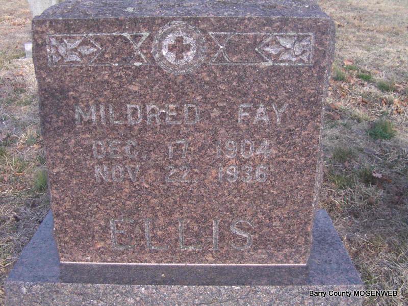 | ELLIS, Mildred Fay | Dec. 17, 1904 | Nov. 22, 1936 | Research Note: Occupation-nurse, residence New York City, age 32. Her middle name was spelled Faye and her father was given as Ern Ellis, charged to Ernest Ellis of Battlefield, MO. Died of "crushing of head following fall from roof." Daughter of Ernest M. Ellis and Ella Mae McKinzie. | Headstone J. T. Mayes Census Phyllis Long King Funeral Home Photo Jay Trace |