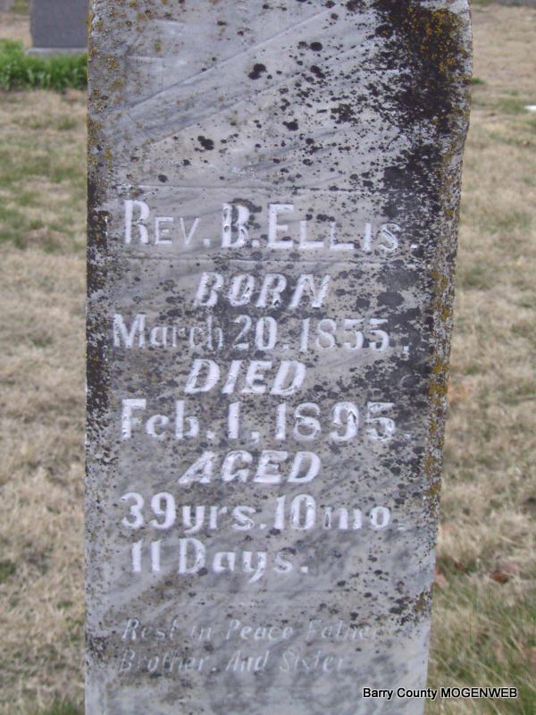 | ELLIS, Benjamin, Rev. | Mar. 20, 1855 | Feb. 1, 1895 | Inscription: "Aged 39 yrs, 10 mos., 11 days" "Rest in Peace Father, Brother and Sister" - Research Note: His wife was Martha J. Short. - B. Ellis married M. J. Short on Sept. 21, 1879 in Barry Co., MO. Son of John Mackey Ellis and Hannah Maples. Benjamin Ellis, age 39, married Ellen (Cook) Rickman, age 33, on Jan. 24, 1895 in Barry Co., MO. | Headstone J. T. Mayes MO Marriage Records Phyllis Long Photo Jay Trace |