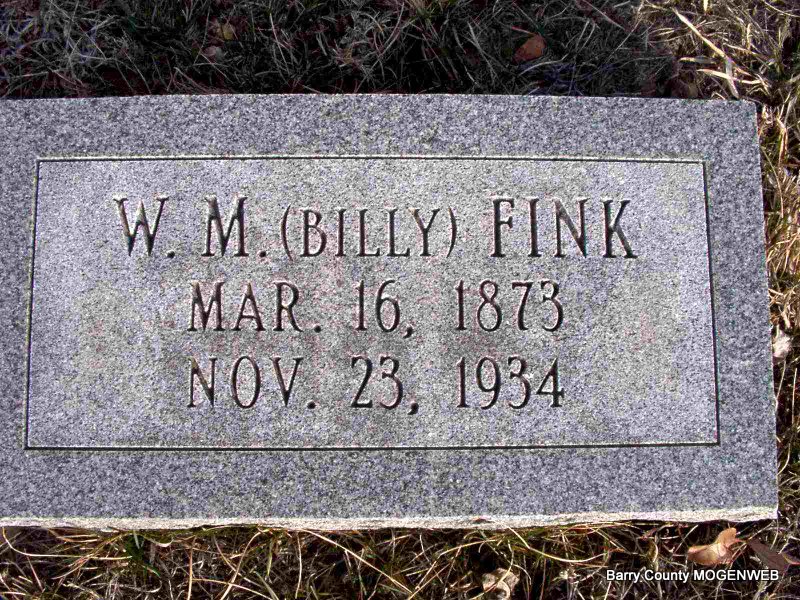 SSW: Emma - Research Note: King Funeral Home Records state that he was born June 25, 1866 and not 1865 as the stone reads. Died of pulmonary tuberculosis. Missouri Death Certificate has date of birth as "about June 15, 1863." Also, his date of death is listed as Jan. 4, 1918, with burial as Jan. 6th. William Fink is listed as informant according to his death certificate. - He first married Sarah Turner. - William R. Gillmore, age 26, married Sarah E. Turner, age 16, on Dec. 22, 1891 in Barry Co., MO. Second, Emma Fink. | Headstone J. T. Mayes Death Certificate Donna Cooper Photo Jay Trace |