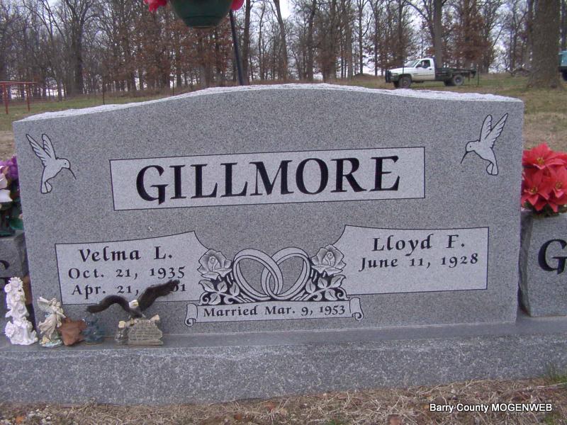 SSW: Lloyd F. Gillmore - Inscription: "Married March 9, 1953" - "Our children Ronnie, Connie, Randy, Freddy Lee, Terrace" - Research Note: She was the daughter of Herman and Sadie (Bowling) Jenkins. - Donna's Note: Monett Times, Velma Gillmore, 65, of Verona, died April 21, 2001 at her home. Mrs. Gillmore was born October 21, 1935, in Galena, the daughter of Herman and Sadie Bowling Jenkins. She was a homemaker. She was married to Lloyd Gillmore, and he survives. Additional survivors include three sons, Ronnie Gillmore of Aurora, Randy Gillmore of Verona, and Terrance Gillmore of Nevada; one daughter, Connie Clevenger of Verona; three brothers, Wilburn Jenkins of Aurora, and Don Jenkins and Dennis Jenkins, both of Verona; one sister, Sylvia Ozbun of Monett; five grandchildren and two great grandchildren. She was preceded in death by one son, Freddie Gillmore; two brothers, Gilbert Jenkins and Willie Jenkins; and one grandchild. Services will be 10:30 a.m. tomorrow, April 24, at Peterson Chapel in Aurora with Rev. Bill Bennett and Rev. Bryan Ozbun officiating. Burial will be in Clay Hill Cemetery under the direction of Peterson Funeral Home of Aurora. Visitation will be from 7 to 8 p.m. today, April 23, at the funeral home. | Headstone J. T. Mayes Peterson Chapel Phyllis Long Photo Jay Trace Monett Times Donna Cooper |