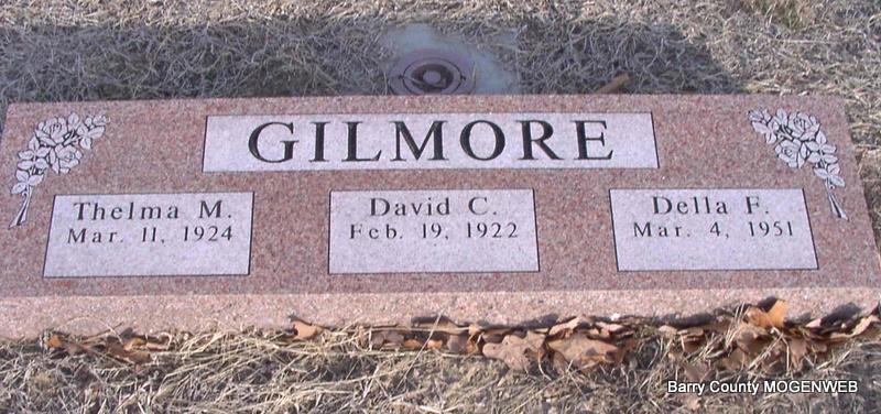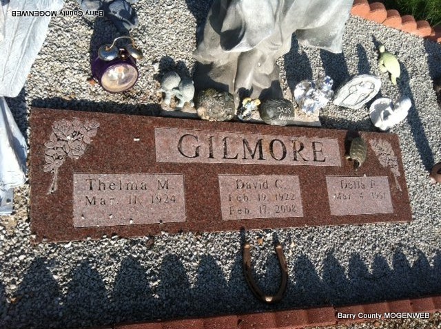 SSW: David C. and Della F. Gilmore - Research Note: She was the daughter of Amos and Minnie (Vaughn) Bowling. She married David Carl Gilmore on August 2, 1941 in Galena, MO. She was preceded in death by her parents, 2 daughters, Sharon Kay and Rose Ann; 1 grandson, David Carl Couch; 5 brothers, Odis, Chester, Claude, Ivan "Puss" and Ish Bowling; and 2 sisters, Sadie Jenkins and Sylvia Essary. - Another Photo | Headstone J. T. Mayes Peterson Funeral Chapel Phyllis Long Photos Jay Trace |