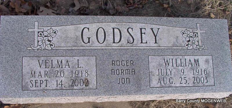 SSW: Velma L. Godsey - Inscription: "Roger, Norma, John" - Research Note: Son of Leon Elbert "Lee" Godsey and Mary Jane "Jennie" Simpson. | Headstone J. T. Mayes Census Phyllis Long Photo Jay Trace |