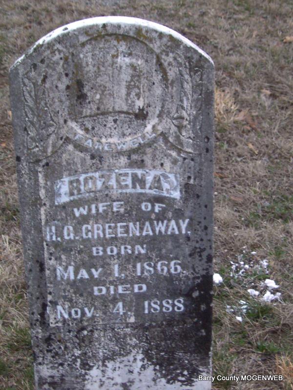 | GREENAWAY, Rozena | May 1, 1866 | Nov. 4, 1888 | Inscription: "Farewell", "Wife of H. G.", has "Mt. Vernon, MO" etched on bottom right side of stone front, as if that was where the stone was made. Research Note: This one was spelled Greenaway. Wife of Henry G. Greenaway/Greenway. Daughter of Alfred Painter and Elizabeth Wilkerson. | Headstone J. T. Mayes Census Phyllis Long Photo Jay Trace |