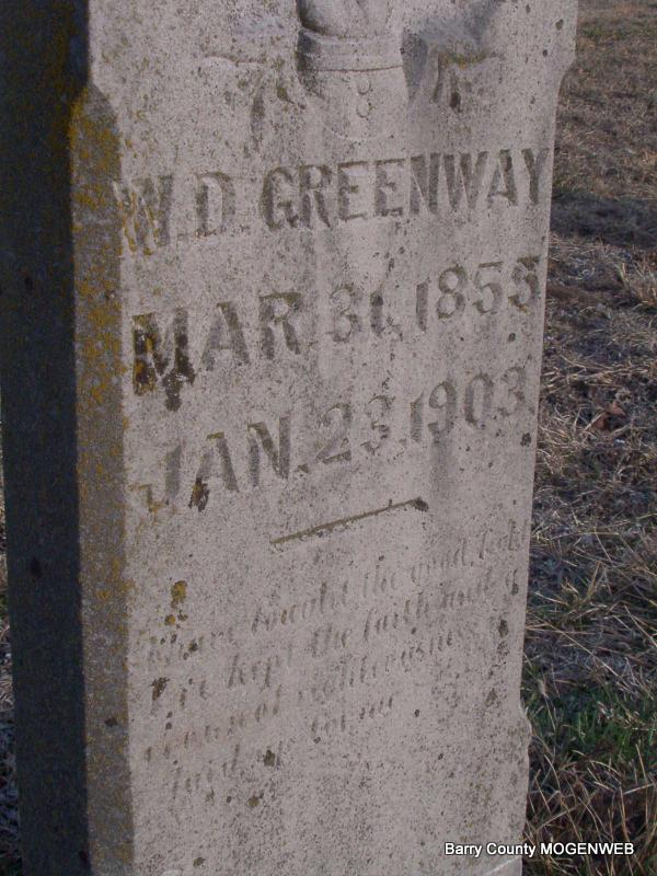 | GREENWAY, William D. | Mar. 31, 1855 | Jan. 23, 1903 | Inscription: "I have Fought The Good Fight And A Crowd of Righteous Is Laid Up For Me" - Research Note: The King Funeral Home Records listed him as William D. Greenway, died Jan. 23, 1903 of consumption. He was a minister at Church Of God. Son of Elisha Bowman Greenway and Rhoda Davis. Husband of Emmaline Donica. - William D. Greenway married Emaline Donica on Sept. 2, 1876 in Barry Co., MO. | MO Marriage Records Phyllis Long King Funeral Home Photo Jay Trace |