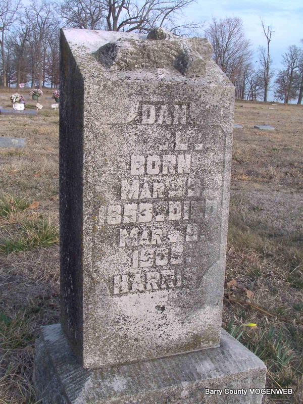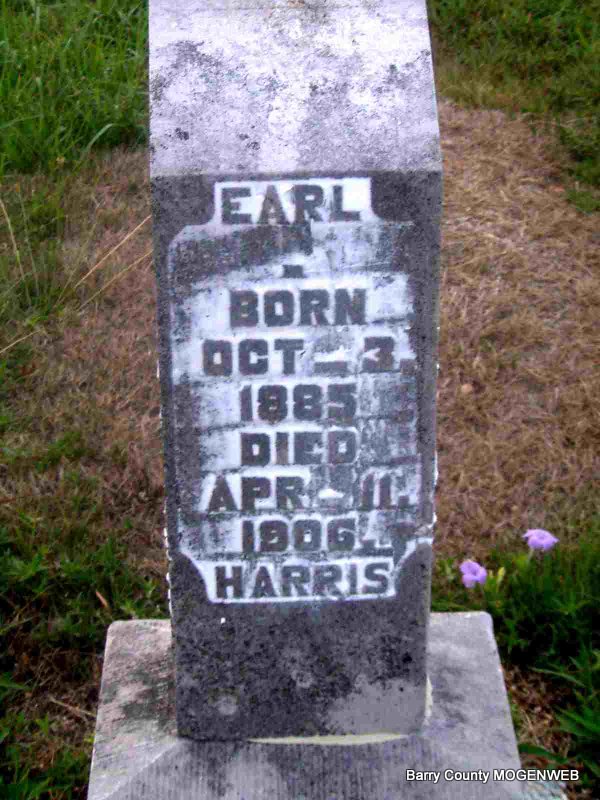 Research Note: Son of William Henry and Elizabeth Harris. - 1900 Census, Pleasant Ridge Township, Barry County, Missouri - Harris, Daniel, Head, born Mar 1854, age 46, married 21 years, born KY, parents born KY; Nancy E., Wife born July 1851, age 48 married 21 years, born IL, parents born TN; Ernest, son, born June 1880, age 19 born MO; Victoria A., Dau. born Mar. 1882, age 18 born MO; Homer H. Son, born Feb. 1884, age 16, born MO; Earl, Son, born Oct. 1886, age 13, born MO; Unice Aaron, Son, born Sept. 1887, age 12, born MO ; Minnie E. Dau., born July 1890, age 10, born MO; Finis V., Son, born May 1898, age 2, born MO. | Headstone J. T. Mayes Census Phyllis Long Photo Jay Trace |