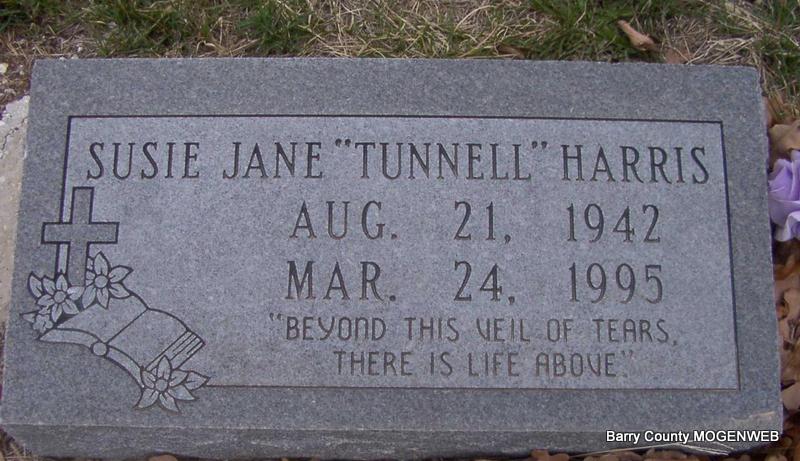 | HARRIS, Susie Jane (TUNNELL) | Aug. 21, 1942 | Mar. 24, 1995 | Inscription: "Beyond This Veil of Tears, There is Life Above" - Research Note: Susie Jane Tunnell, age 18, married Wayne Harris, age 20, on Sept. 16, 1960 in Lawrence Co., MO. Ruth Harris, mother of Wayne gave consent. | Headstone J. T. Mayes MO Marriage Records Phyllis Long Photo Jay Trace |