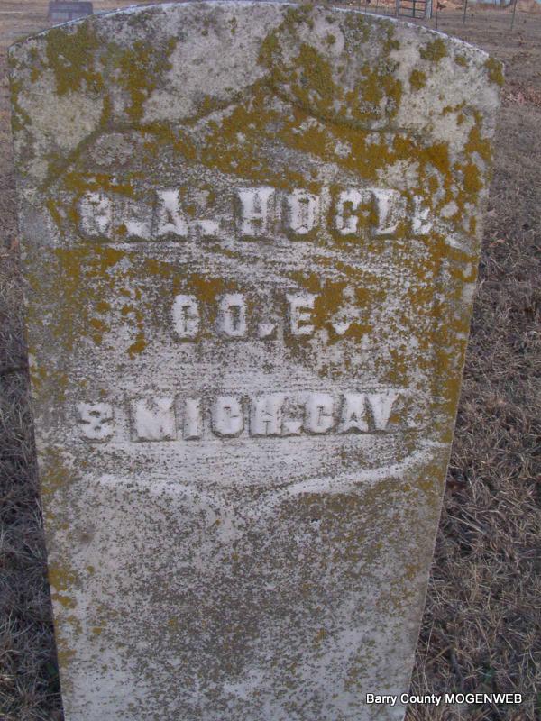 No Date | Inscription: "Co E 8 Mich Cav" - Research Note: Civil War Veteran. His wife was Frances Caroline Morse. George enlisted as a private at Marengo, Michigan on Dec. 1, 1862 at age 21. Enlisted in Company F, Michigan 8th Cavalry Regiment on 20 Jan. 1863. Promoted to Full Corporal on 15 June 1865. Mustered out on 22 Sept. 1865 at Nashville, TN. Frances filed for his pension in 1902. George was still living in the 1900 census. Parents may have been Albert and Polly Hogle. | Headstone J. T. Mayes Civil War Records Census Phyllis Long Photo Jay Trace |