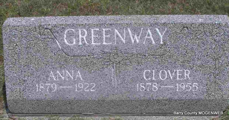 | GREENWAY, Anna (OWENS) | 1879 | 1922 | Research Note: Anna was the first wife of Grover Greenway. Annie Owens, age 23, married E. G. Greenway, age 24, on June 30, 1903 in Cassville, Barry Co., MO. | Headstone J. T. Mayes Note Sheryl Shaw Photo Jay Trace |