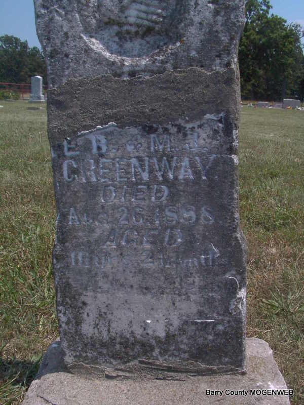 | GREENWAY, Henry G. | Abt 1862 | Dec. 8, 1893 | Research Note: Son of Elijah B. Greenway and Rhoda Davis. Rozena Painter was his first wife. Henry G. Greenway second married Caldona Grimmitt on Feb. 3, 1889 in Barry Co., MO. - Cassville Republican, Dec. 21, 1893 - Died, Dec. 8, 1893, Henry Greenway, aged nearly 32 years. The deceased leaves a wife and three children and a host of relatives and friends to mourn his departure. He was a member of the Methodist Protestant Church, and was a devoted Christian at the time of his death. The remains were interred in the Clay Hill Cemetery. Services conducted by Rev. B. Ellis. May God comfort the family in their lonely hours and lead their minds to the brightness of the resurrection morning, which the mangled body will be brought like unto Christ's glorious body. How uncertain in the time and the manner of our grief. | Online Newspapers Census MO Marriage Records Phyllis Long |