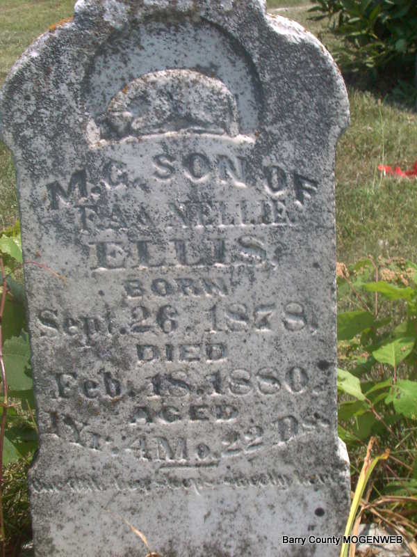 | ELLIS, Marshall G. | Sept. 26, 1878 | Feb. 18, 1880 | Inscription: "Son of F. A. and Nellie - M. G. Ellis Aged 1 yr, 4 mo, 22d - Our Little Boy Sleeps Sweetly Here." - Research Note: Son of Frank A. Ellis and Nellie Arline Robbins. | Headstone J. T. Mayes Note Phyllis Long Photo Jay Trace |