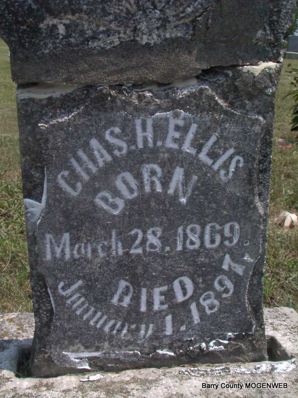 | ELLIS, Charles H. | Mar. 28, 1869 | Jan. 1, 1897 | Research Note: Son of Perry S. Ellis and Sarah F. Lemaster. He first married Mollie Snuffer. Second, Dellah Hughes. - Charles H. Ellis, age 26, married Dellah Hughes, age 17, on Nov. 14, 1895 in Cassville, Barry Co., MO. A. A. Hughes and Cordelia Hughes, father and mother of Dellah Hughes, consent to the marriage of these parties. | Headstone J. T. Mayes Census MO Marriage Records Phyllis Long Photo Jay Trace |