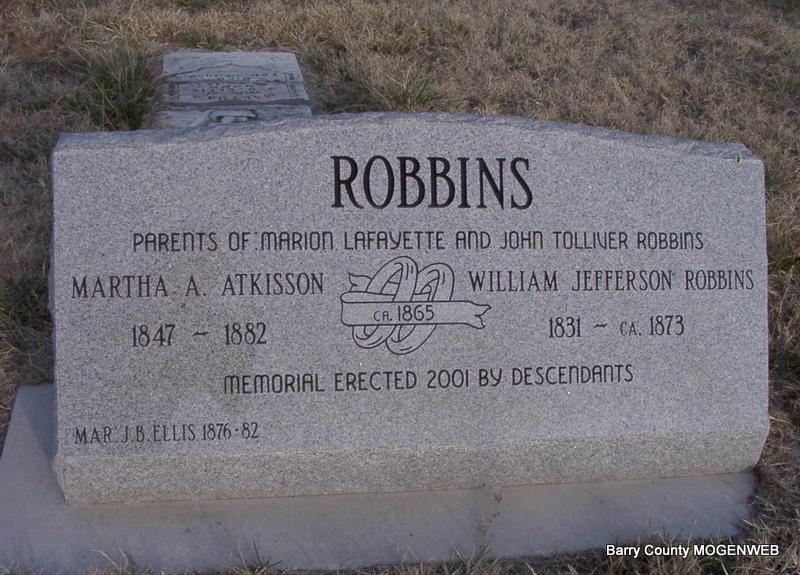 | ELLIS, Martha A. (ATKISSON) (ROBBINS) | Dec. 25, 1847 | Feb. 22, 1882 | Inscription: "Her Work Is Done And She Is Fully Blessed, She Fought The Fight The Victory Won And Entered Into Rest." - Research Note: Martha first married William Jefferson Robbins, second Jeremiah B. Ellis on May 21, 1876 in Barry Co.,MO. Daughter of Benjamin Atkisson and Mary Catherine Kirk. - See Martha A. Robbins | Headstone J. T. Mayes Census MO Marriage Records Phyllis Long Photo Jay Trace |
