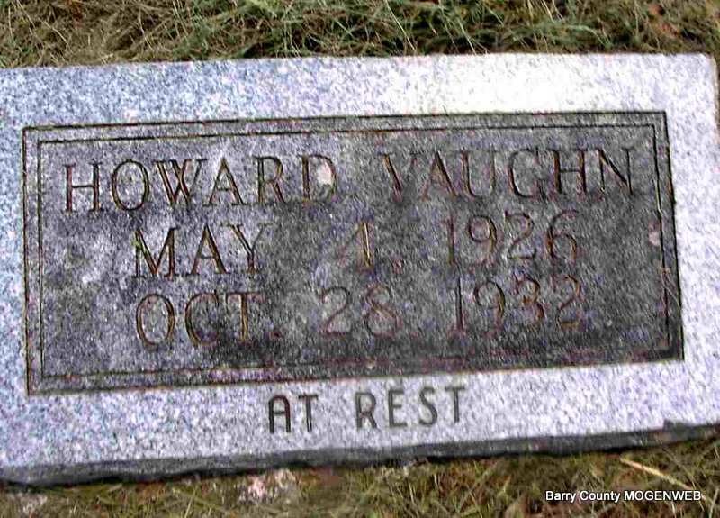 | VAUGHAN, Howard | May 4, 1926 | Oct. 28, 1932 | Inscription: "At Rest" - Research Note: William Howard Vaughan was the son of Claude Allen Vaughan and Willie May Swaffor. | Headstone J. T. Mayes Census Phyllis Long Photo Jay Trace |