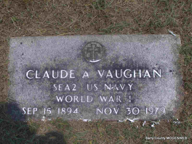 | VAUGHAN, Claude Allen | Sept. 15, 1894 | Nov. 30, 1979 | Inscription: "SEA 2 US NAVY - WORLD WAR I" - Research Note: Son of Andrew Vaughan and Harriet Strong (Creason) (Hains/Haynes) (Vaughan) Smith. His wife was Willy May Swaffor. | Headstone J. T. Mayes Census Phyllis Long Photo Jay Trace |