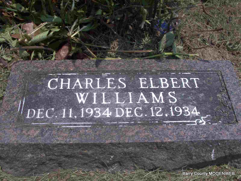 | WILLIAMS, Charles Elbert | Dec. 10, 1934 | Dec. 11, 1934 | Research Note: Previous entry had date of birth as Dec. 11, 1934 and date of death as Dec. 12, 1912. Cause of death given as "Premature birth." Father Waldo Williams born in Barry Co., MO. Mother Mattie M. Williams born in Lawrence Co., MO according to King Funeral Home records. | Headstone J. T. Mayes King Funeral Home Photo Jay Trace |