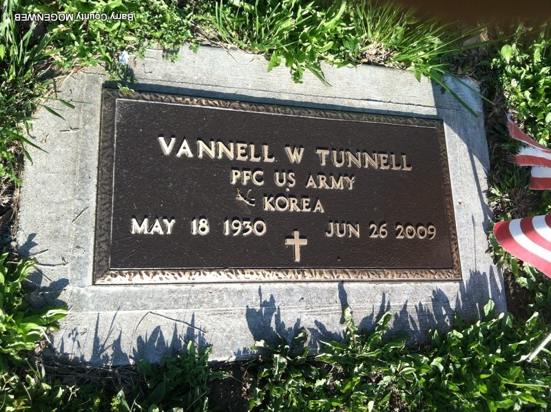 Incription: "PFC US ARMY - KOREA" - Research Note: Son of Finis Tunnell and Leona Means. His wife was Janie. - Vannell William Tunnell, age 30, married Marjorie Buckner, age 15, on Aug. 12, 1961 in Aurora, Lawrence Co., MO. Vannell William Tunnell, age 47, married Orah Jane Eutsler, age 36, on July 1, 1977 in Barry Co., MO. | Crafton-Cantrell Funeral Home Connie Schmidt MO Marriage Records Phyllis Long Photo Jay Trace |
