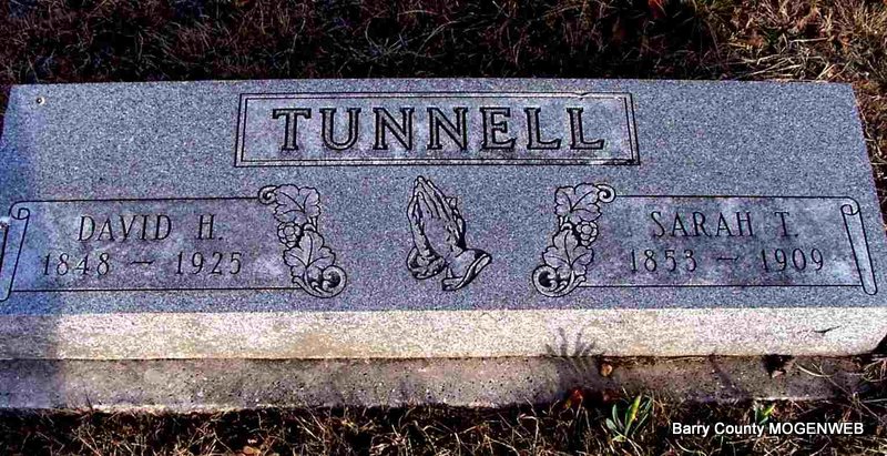 SSW: Sarah T. - Research Note: His first wife was Sarah Tennessee Williams married on Nov. 19, 1870 in Barry Co., MO. Death Certificate gives father as Jessie Tunnell and mother as Nancy Rebecca "Becky" Davis. Death Certificate gives his wife as Virgie Tunnell and she was the informant. - David H. Tunnell, age 63, married Virgie Madole, age 30, on Nov. 19, 1911 in Aurora, Lawrence Co., MO. - 1920 Census, Ozark, Barry, Missouri - David H. Tunnell, head, age 69, born TN; Virgie, wife, age 36, born MO; Opal Madole, step-daughter, age 17, born MO. | Headstone J. T. Mayes Death Certificate Donna Cooper MO Marriage Records Census Phyllis Long Photo Jay Trace |