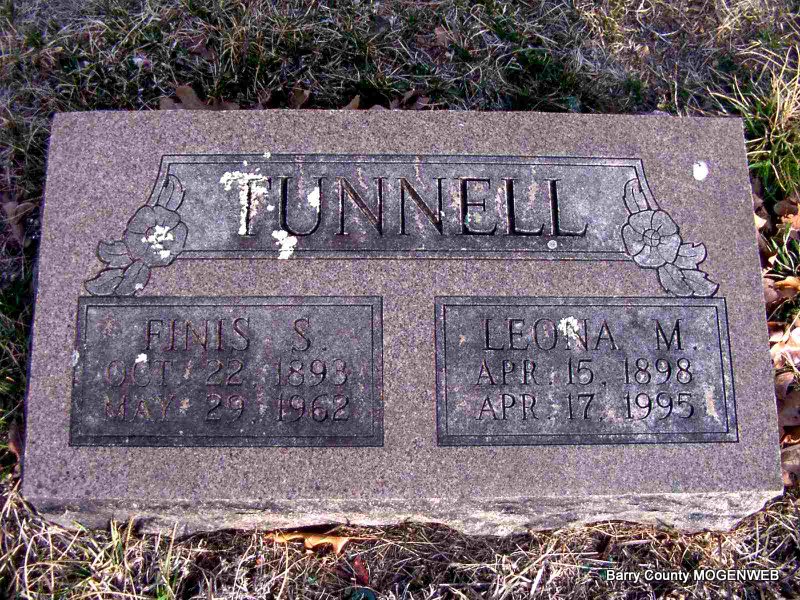SSW: Leona M. Tunnell - Research Note: He was DOA at the Aurora Hosp. Son of Thomas M. Tunnell and Sarah Jane Berry. Husband of Leona Means and she was the informant on the death certificate. Finis first married Alpha Horner age 15, on Aug. 1, 1915 in Barry Co., MO. No age was given for Finis. Finis Tunnell age 23, married Leona Means, age 21 on May 10, 1919 in Lawrence Co., MO. | Headstone J. T. Mayes Death Certificate MO Marriage Records Phyllis Long Photo Jay Trace |