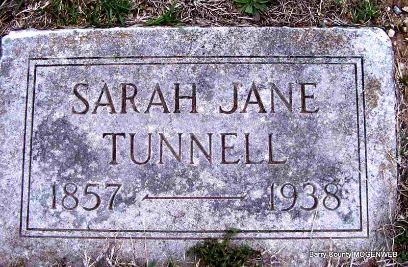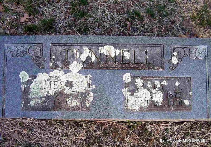 SSW: Mary - Research Note: Son of Thomas Miller Tunnell and Sarah Jane Berry. Spencer Tunnell of Verona, MO was the informant on the death certificate. James Tunnell, age 23, married Mary B. Betterton, age 19, on Oct. 3, 1897 in Barry Co., MO. James Tunnell, age 28, married Mary Beck, age 28, on Nov. 9, 1902 in Barry Co., MO. Mary Frances (Hickman) Beck was the widow of William Sherman Beck. | Headstone J. T. Mayes Death Certificate MO Marriage Records Census Phyllis Long Photo Jay Trace |