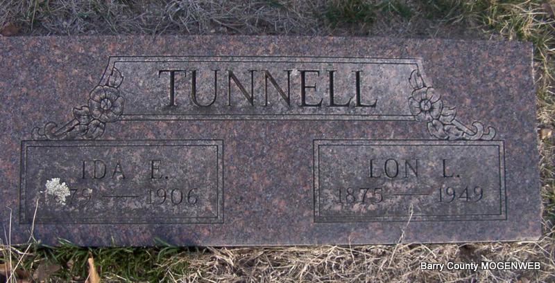 | TUNNELL, Ida E. (ELLIS) | 1879 | 1906 | SSW: Lon L. Tunnell - Research Note: Alonzo Tunnell, age 22, married Ida Ellis, age 18, on Nov. 11, 1897 in Barry Co., MO. Daughter of Henry Ellis and Mary Card. | Headstone J. T. Mayes MO Marriage Records Census Phyllis Long Photo Jay Trace |