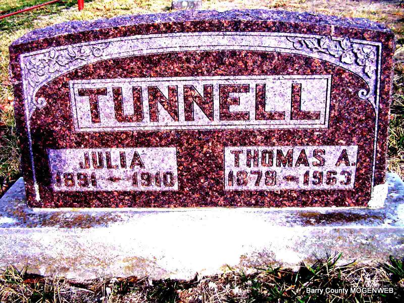 SSW: Julia - Research Note: Son of Thomas Miller Tunnell and Sarah Jane Berry. - Thomas A. Tunnell, age 27, married Julia Nivens, age 17, on Jan. 1908 in Lawrence Co., MO. Marriage License has "Canceled, not issued" written across it. Mrs. Dora Means of Aurora, MO was the informant on the death certificate. Thomas Alexander Tunnell, age 34, married his second wife, Clara King, age 30, on Mar. 29, 1912 in Barry Co., MO. | Headstone J. T. Mayes Death Certificate MO Marriage Records Census Phyllis Long Photo Jay Trace |