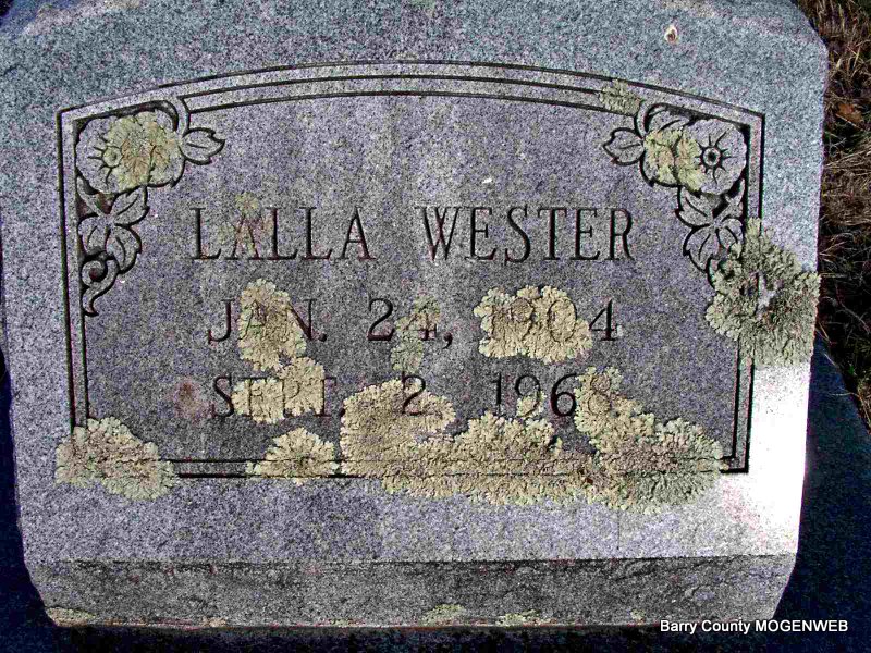 | WESTER, Lalla Ester (FEASTER) (NASH) (WYMAN) | Jan. 24, 1904 | Sept. 2, 1968 | Research Note: Daughter of William Elbert Feaster and Callie Gilmore. L. E. Feaster married W. L. Nash on Apr. 14, 1923 in Aurora, Lawrence Co., MO. Lalla Nash, age 27, married C. V. Wyman, age 27, on Mar. 28, 1931 in Aurora, Lawrence Co., MO. - 1940 Census, Tulsa, Tulsa, Oklahoma - Lalla Wyman, head, age 37, married, born MO, lived in Aurora, MO in 1935, dry wrapper at laundry; William Nash, son, age 17, born MO; Fred Wells, lodger, age 44, single, born MO, lived in Aurora, MO in 1935, plumbers helper. | Headstone J. T. Mayes Census MO Marriage Records Census Phyllis Long Photo Jay Trace |