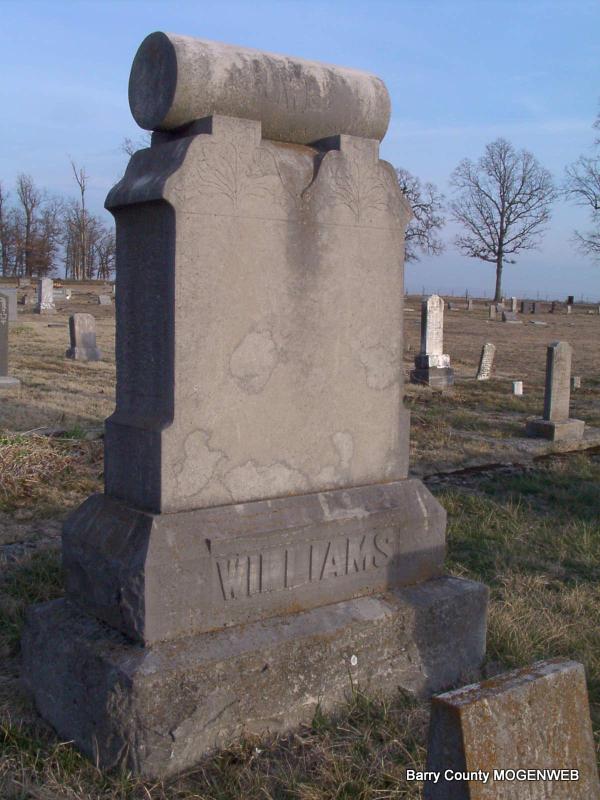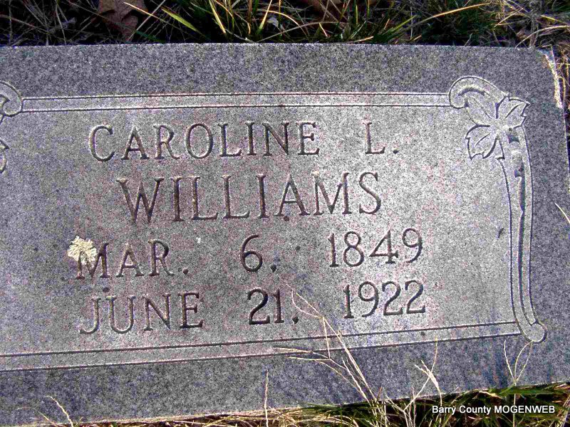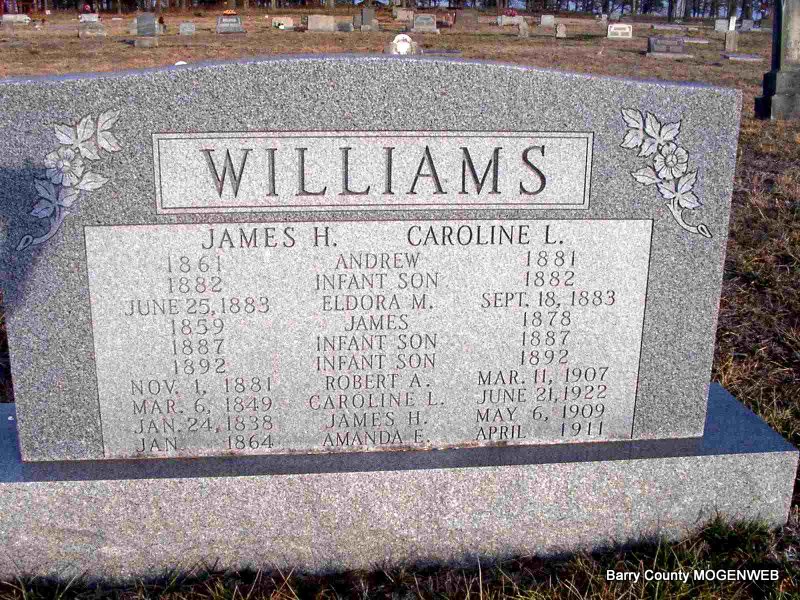 SSW: Amanda, Albert, Andrew, Eldora M., Infant Williams (1882), Infants Williams, (1887 - 1892) James H. (1838-1919), James H. (1859-1878) and Robert A. - Research Note: Wife of James Harrison Williams. Mother of Martha Jane (Williams) Young, Robert A. Williams, Eldora M. Williams, Charles Walter Williams, Myrtle Julie (Williams) Wagnon, Floyd Wesley Williams. Step-mother of William E. Williams, James H. Williams (b. 1859), Andrew J. Williams, Amanda E. Williams, Frank Welford Williams, and Elijah Pinkney Williams. Caroline Murphy married James H. Williams on Oct. 18, 1876 in Barry Co., MO. Caroline first married Mr. Murphy and had a daughter Alice V. Murphy born MO, who is with James H. Williams and Caroline in the 1880 Census, Crane Creek, Barry, Missouri. - Another Stone | Note Connie Schmidt Census Phyllis Long Photos Jay Trace |