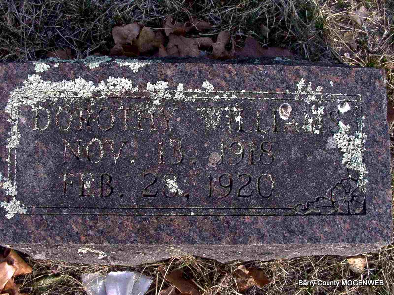 | WILLIAMS, Dorothy | Nov. 13, 1918 | Feb. 28, 1920 | Research Note: "Dorcie" Jane Williams was the daughter of Elbert W. Williams and Margaret Ann Wagnon. | Headstone J. T. Mayes Note Connie Schmidt Photo Jay Trace |