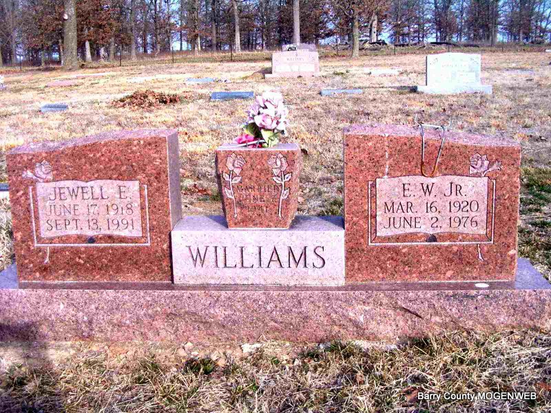 SSW: Elbert W. Williams, Jr. - Inscription: "Married June 7, 1941" - Research Note: She was the daughter of Martin Langford Johnson and Rose Missouri (Walker) Johnson; widow of E. W. "Bill" Williams, Jr.; married at King's Prairie; she had resided in MO her entire life; children of E. W. and Jewel are: James Richard, Sarah Karen, and Kenneth Wayne. | Headstone J. T. Mayes Crafton-Cantrell Funeral Home Connie Schmidt Photo Jay Trace |