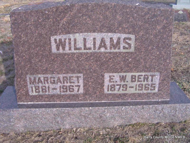SSW: E. W. "Bert" Williams, Sr. - Research Note: Margaret Wagnon, age 21, married E. W. Williams, age 24, on July 12, 1903 in Barry Co., MO. Daughter of James M. Wagnon and Melissa Hannah Wiley. Thelma Williams of Aurora, MO was the informant on the death certificate. | Headstone J. T. Mayes Death Certificate MO Marriage Records Census Phyllis Long Photo Jay Trace |