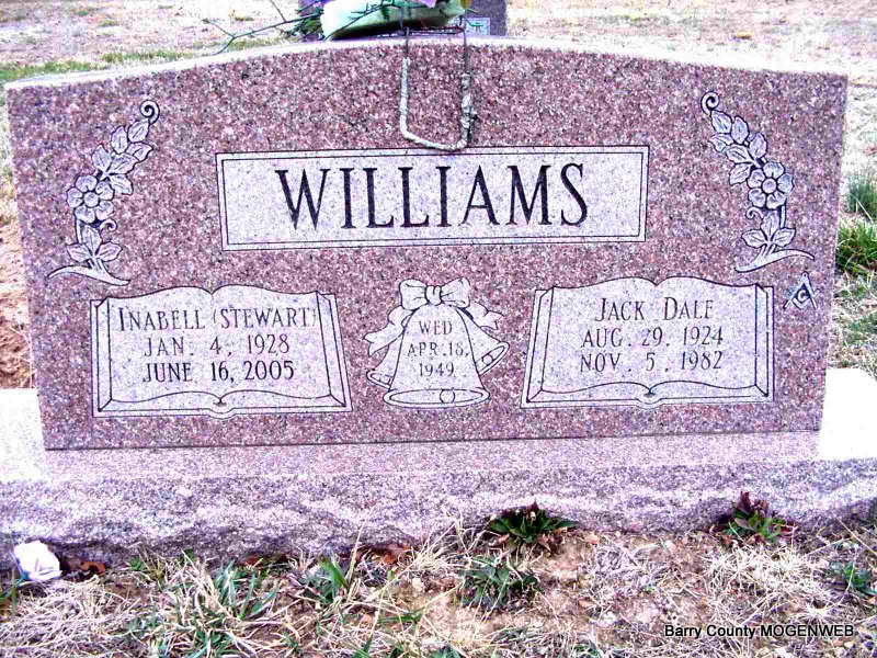 | WILLIAMS, Jack Dale | Aug. 29, 1924 | Nov. 5, 1982 | SSW: Inabell Williams - Inscription: "Wed, Apr. 18, 1949" - Research Note: Married to Inabell Stewart on April 18, 1949. Jack was the son of Elbert "Bert" W. Williams and Margaret Ann Wagnon. He worked for the Frisco Railroad for about 20 years. | Headstone J. T. Mayes Note Connie Schmidt Census Phyllis Long Photo Jay Trace |