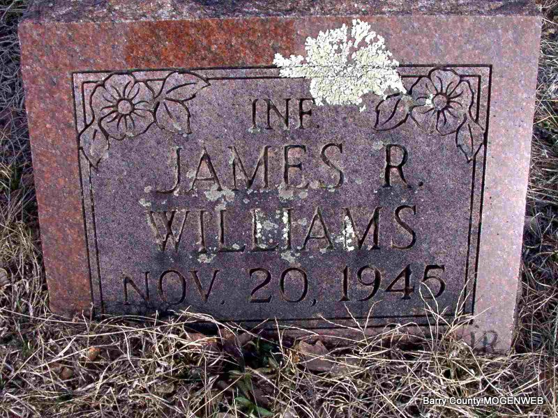 Inscription: "Infant" - Research Note: He lived 10 hours. Son of Elbert W. Williams Jr. and Jewell Johnson, both born Barry Co., MO. | Headstone J. T. Mayes Death Certificate Phyllis Long Photo Jay Trace |