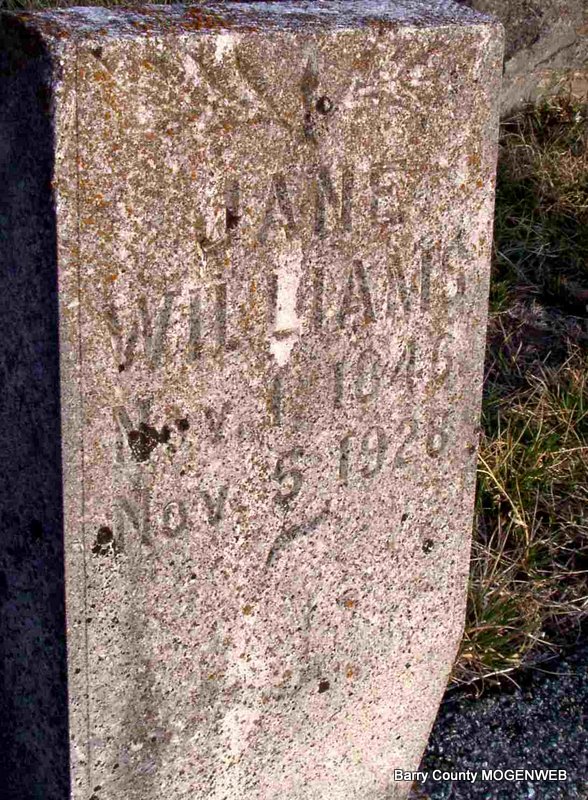 | WILLIAMS, Cynthia Jane (LEMASTER) | Nov. 1, 1846 | Nov. 5, 1928 | Research Note: Cynthia Jane (Lemaster) Williams, a daughter of Jacob and Lucinda (Rickman) Lemaster, married Elias W. Williams on Mar. 6, 1864. Her name was given as Cinthia J. Milinda (Lemaster) Williams in the King Funeral Home records. Cause of death was listed as "infirmities-old age." Her father was listed as Jacob Lemaster, and her mother listed as Lucinda Rickman, both born in TN according to the King Funeral Home records. - Wheaton Journal, November 8, 1928 - Cyntha Jane Williams, was born in Lawrence County on Buck Prairie November 1, 1846 and was married to Elias W. Williams March 6, 1864. To this union was born eleven children, six and her husband having preceded her in death. The five living are: Mrs. May Hagarty of East St. Louis, Ill., Allen of Lake Worth, Fla., Mrs. Ella Suttles of Jenkins, Bert, with whom she has lived since her husband's death, and Mrs. Ula Cobb of Aurora. She also raised two stepchildren that she loved as her own, one having preceded her in death, the other John T. of Gotebo, Okla.; thirty-eight grand children, forty great grand children, twelve great-great grand children; also two brothers, G. W. Lemaster of Webb City, Van Lemaster of Marionville; two half sisters and two half brothers, Mrs. Rhodena Davis of Golden, Mo., Mrs. Isabelle Williams of Arkansas, Nat Lemaster of Fairland, Okla., and Abe Lemaster of California survive. | Headstone J. T. Mayes Online Obit Census Phyllis Long King Funeral Home Photo Jay Trace |
