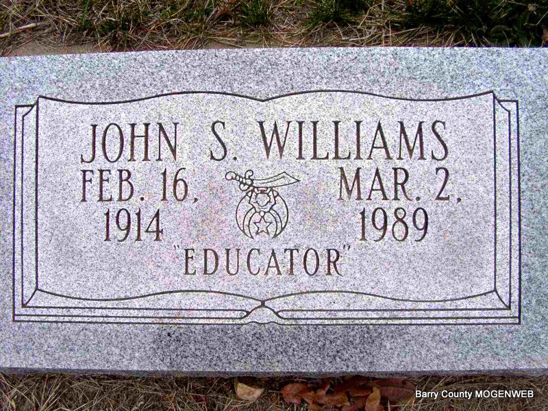 Inscription: "Educator" - Research Note: Shriner symbol on stone. Son of Elbert W. Williams, Sr. and Margaret Wagnon; he was divorced and a teacher in public schools for 45 yrs. - Family History of Williams-Eaton, McBroom-Whiteley and Related Lines by Derl Williams - John was the son of Elbert "Bert" W. Williams and Margaret Ann Wagnon; he married first, Apr. 16, 1938 in Crane, Stone Co., MO., to Dorris Rufina Williams. Dorris and John's children were: Oren Dale, Darla Ann and John Sherman II. He married second, Dec. 17, 1973 in Ottawa Co. OK., Mary Ann (Gibbons) Walker, daughter of Fredric James Gibbons and Cora Lottie Lester. Mary was born Dec. 17, 1919 in Monett, Barry Co., MO. John was a teacher at Aurora and Mt. Vernon and later became the Lawrence Co. State Superintendent of Schools. Reprinted with permission of E. Derl Williams. | Crafton-Cantrell Funeral Home Connie Schmidt Photo Jay Trace |
