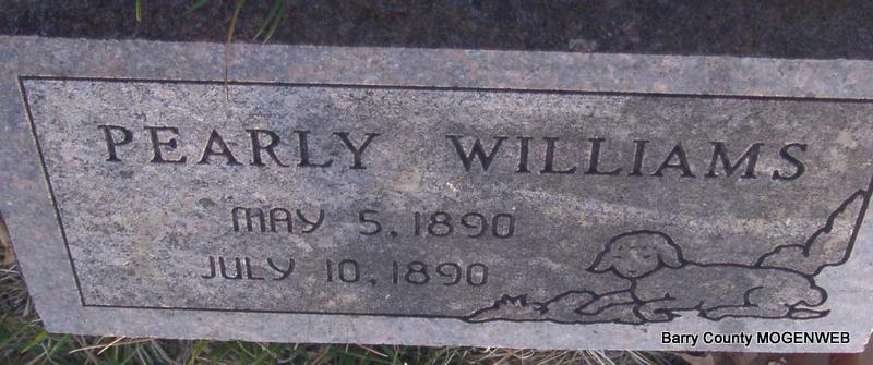 | WILLIAMS, Pearly | May 5, 1890 | July 10, 1890 | Research Note: Son of John Isaac and Mattie Williams. Stone matches the one for Henery Williams. - Pearly was actually spelled Perley and was a male not a female. He was the 3rd child (2nd son) of John Isaac and Mittie Lavenia (Eaton) Williams. The stone was placed in the 1970's by his sister, Lavenia (Williams) McBroom. The history written by E. Derl Williams, published in 1991 gives his DOB as Apr. 5, 1893 near Madry and died when he was about 2-3 months old and buried beside his brother, Henry. Henry's DOB was given as Dec. 1, 1891 in McMinn Co., TN and died abt. 1892 near Madry. He came by train with his mother from TN and died just a few months later. | Headstone J. T. Mayes Note Phyllis Long E. Derl Williams Connie Schmidt Photo Jay Trace |