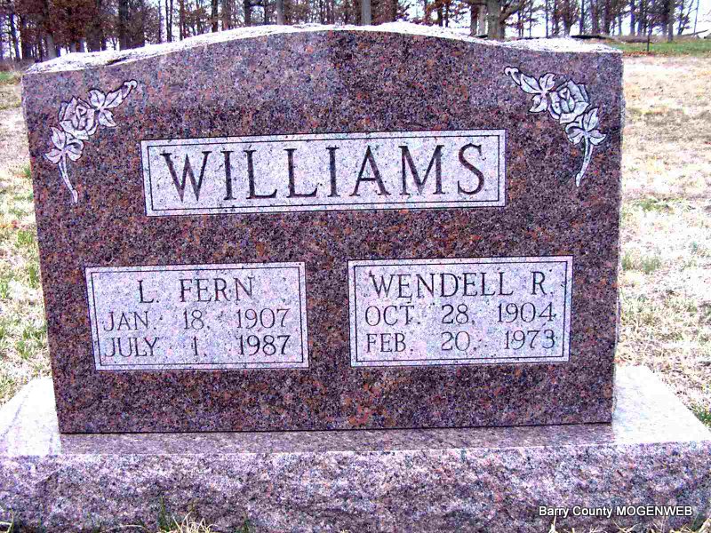 SSW: L. Fern - Research Note: He was the son of Elbert (Bert) W. Williams and Margaret Ann Wagnon. Husband of Lola Fern Mullen. - September 1, 1917, Cassville Democrat - Wendell Williams, 13 year old son of E. W. Williams, took advantage of his father's absence on the 14th, and ran away from home. His mother started him to school in the morning but instead of going, went to the road, disposed of his straw hat and pencil by the side of the road and wrote on the hat, "Good bye all. I will write." He then went to Joplin where he remained two days when he concluded he would be needed at home and started back. He got as far as Pierce City, where he was apprehended by the marshal and held until his father's arrival. | Headstone J. T. Mayes Crafton-Cantrell Funeral Home Connie Schmidt Online Newspapers Phyllis Long Photo Jay Trace |