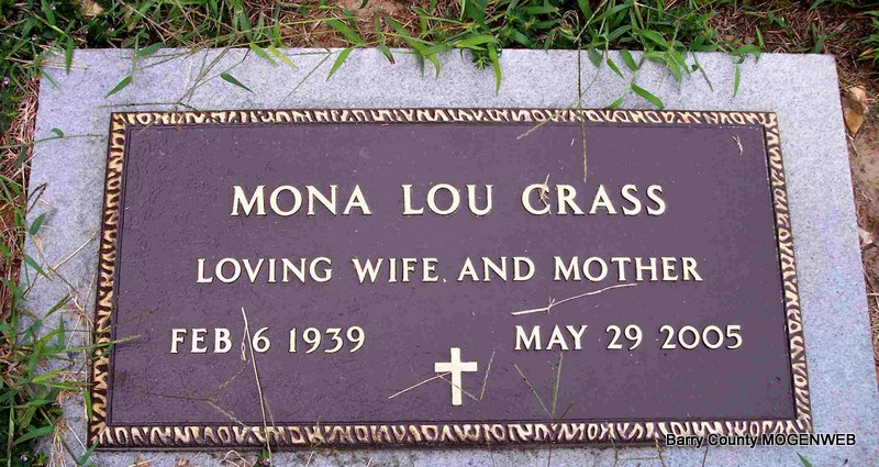 | CRASS, Mona Lou (BUTLER) | Feb. 6, 1939 | May 29, 2005 | Inscription: "Loving Wife and Mother" - Research Note: Wife of Jack Donald Crass. Daughter of Elmer Fenton Butler and Hilma Mae Epperly. | Census Phyllis Long Photo Diana Cope |