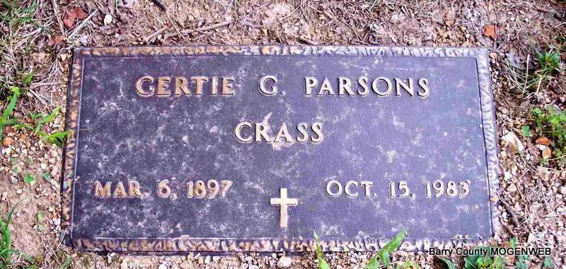 | CRASS, Gertie G. (PARSONS) | Mar. 6, 1897 | Oct. 15, 1983 | SSW: Otto H. - Research Note: Daughter of Henry Goodlow Parsons and Walsie J. Sims. - Another Stone | Census Phyllis Long Photo Diana Cope |