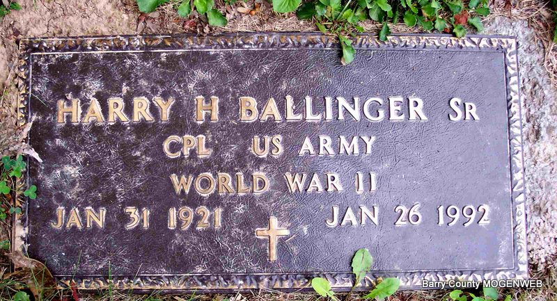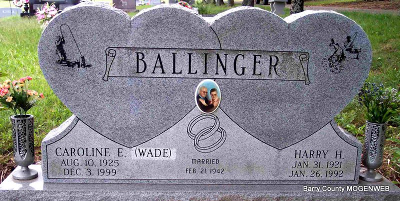 SSW: Caroline E. Wade - Inscription:"Married Feb. 21, 1942" - Research Note: Jenkins, Barry Co., MO resident. Son of Harry Ballinger and Clara M. Brown. - Military Stone - Inscription: "CPL US ARMY WORLD WAR II" | SS Claims Index Newspapers.com Phyllis Long Photo Diana Cope |