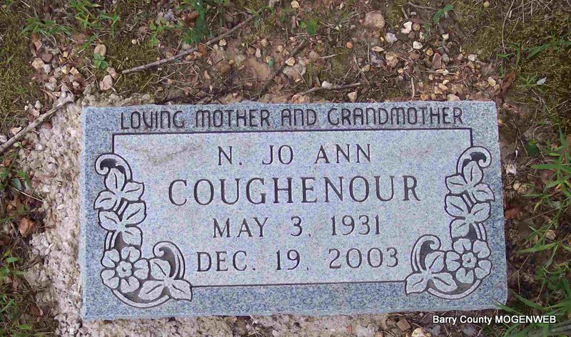 Inscription: "Loving Mother and Grandmother" - Research Note: Daughter of Walter Lee Nall and Maude Miller. Her family moved to New Mexico when she was 3, after her father was killed in an accident. She grew up in Clovis and was a 1949 graduate of Clovis High School. She married Francis Coughenour on June 28, 1952. In 1953 they moved to the Cassville area where she made her home for the past 50 years. Family members said she loved her family and people. She was preceded in death by her husband; her parents; her step-father, M.R. Thomas; and three brothers, Dwain, Melvyn and Darryl Thomas. Survivors include a son, Brent Coughenour (and wife, Angie) of Parkman, Wyo.; two sisters, Wylodene Morgan of Alamogordo and Shirley Maize of Clovis; and two granddaughters, Rachel and Amanda Coughenour of Parkman. Cremation has taken place. Burial was at Jenkins, Mo. | Clovis News Journal TX Birth Index Phyllis Long Photo Diana Cope |