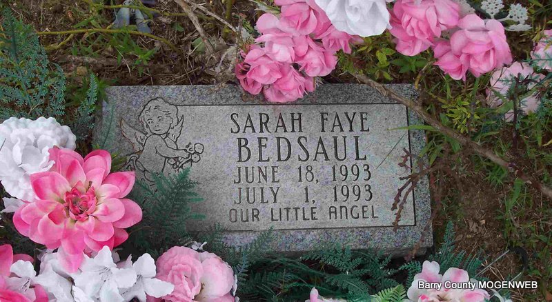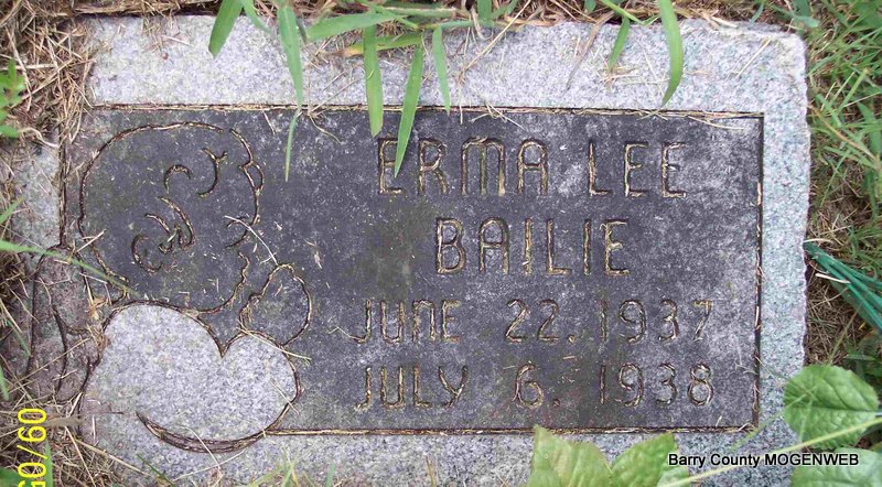 | BAILIE, Erma Lee | June 22, 1937 | July 6, 1938 | Research Note: Daughter of Orvie B. Bailey and Irene Ray. - Cassville, Missouri · Thursday, July 7, 1938 - Erma Lee, little one year old babe of Mr. and Mrs. Ovbie Bailey of the Shell Knob community, died Tuesday night, July 6. Funeral serviced are to be held Thursday, today, with Horine-Culver in charge. | Newspapers.com Phyllis Long Photo Diana Cope |