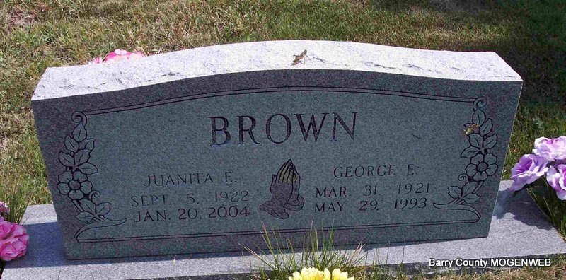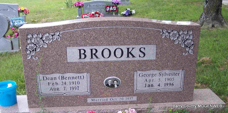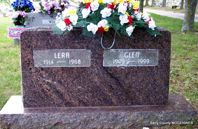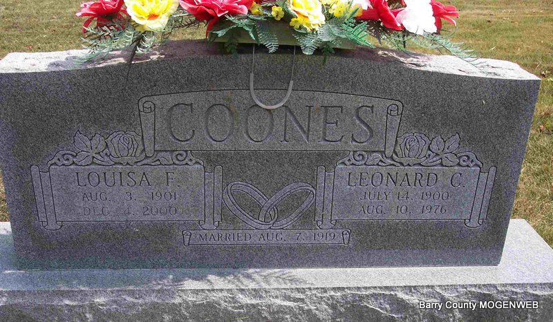 SSW: Leonard C. - Inscription: "Married Aug. 7, 1919" - Research Note: Daughter of Joseph and Alice Foster, married Leonard C. Coones on August 7, 1919, in Cassville, and he preceded her in death August 10, 1976. She moved to Cassville in 1939 where she and her husband owned and operated Coones Superette Market for over 40 years. She was preceded in death by one daughter, Lucille Turner; two brothers, three sisters, and one great great grandson. She had 21 grandchildren, 44 great grandchildren, and 34 great great grandchildren. | Monett Times Nov. 6, 2000 Mary Homesley Photo Diana Cope |