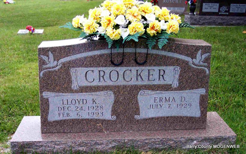 | CROCKER, Loyd Keller | Dec. 24, 1928 | Feb. 6, 1993 | SSW: Erma D. - Research Note: Marriage License - Groom: Lloyd K. Crocker of 906 W. 23rd Place, Tulsa, OK, born Dec. 24, 1928 in Pryor, OK and Bride: Mary Delia Noel of 803 Clark Ave., Webster Grove, MO, born Feb. 6, 1923 in Atchison, KS. It doesn't give a date. - Lloyd K. Crocker, age 53, married Erma D. Redding, age 52, in Smith Co., TX on May 18, 1982. - 1930 Census, Hogan, Mayes, Oklahoma - Arthur Keller Crocker, age 46, married at age 26, born KS, parents born PA; Myrtle, wife, age 28, married at age 22, born AL, parents born AL; Loyd, adopted son, age 2, born OK, not given where parents were born. | Census TX Marriage Index Phyllis Long Photo Diana Cope |