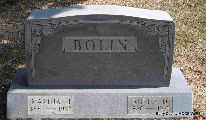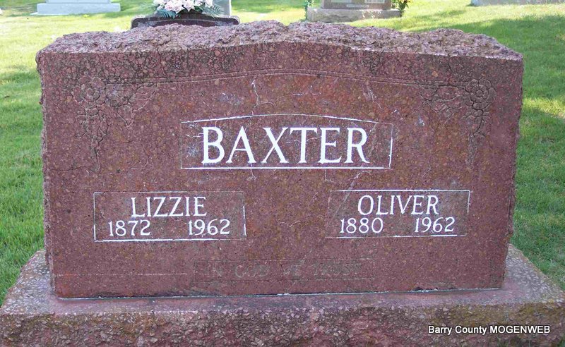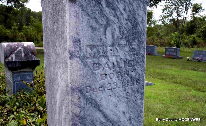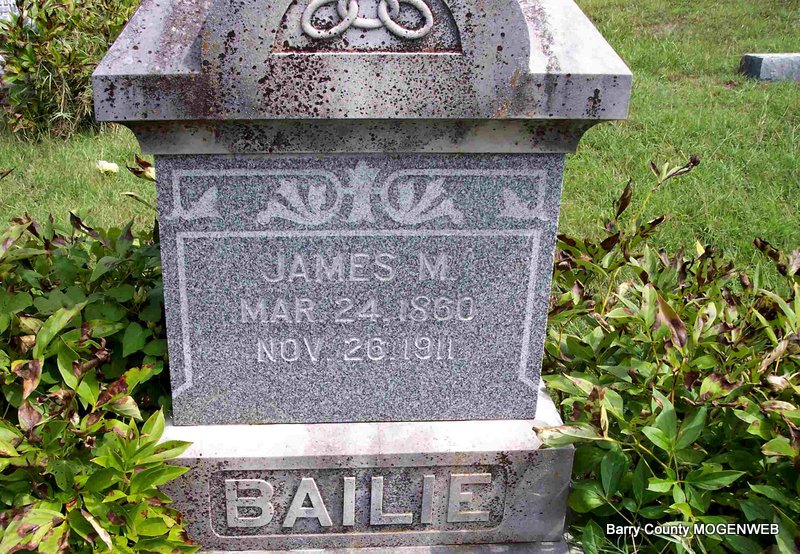 Research Note: His death certificate states his birth year was 1862, not 1860 as the stone reads. It also reads that his parents were Samuel and Elizabeth (Johnson) Bailie. His father was born in VA and his mother was born in AL. Burial was in Zion Cemetery. King Funeral Home Records reported that he died of stomach trouble at age 51 years, 8 months, 2 days. Cemetery is listed as "Zion in Barry County." - Cassville Republican, December 7, 1911 - Died at his home near Clio, Nov. 25th, James Bailie, age 52 years. Jim was well known and well respected by all and was a member of the Methodist Church. He leaves a wife, one step-son, one step-daughter, an aged mother, five brothers and five sisters and a host of other relatives and fiends to mourn his departure. The bereaved have the sympathy of the entire community. The funeral services were conducted by Rev. Moore of Aurora and the body laid to rest in the Clio Cemetery. - James M. Bailie, age 40, married Ollie T. Riddle, age 26, on Mar. 24, 1901 in Barry Co., MO. | Death Certificate King Funeral Home Jay Trace MO Marriage Records Online Newspapers Phyllis Long Photo Diana Cope |