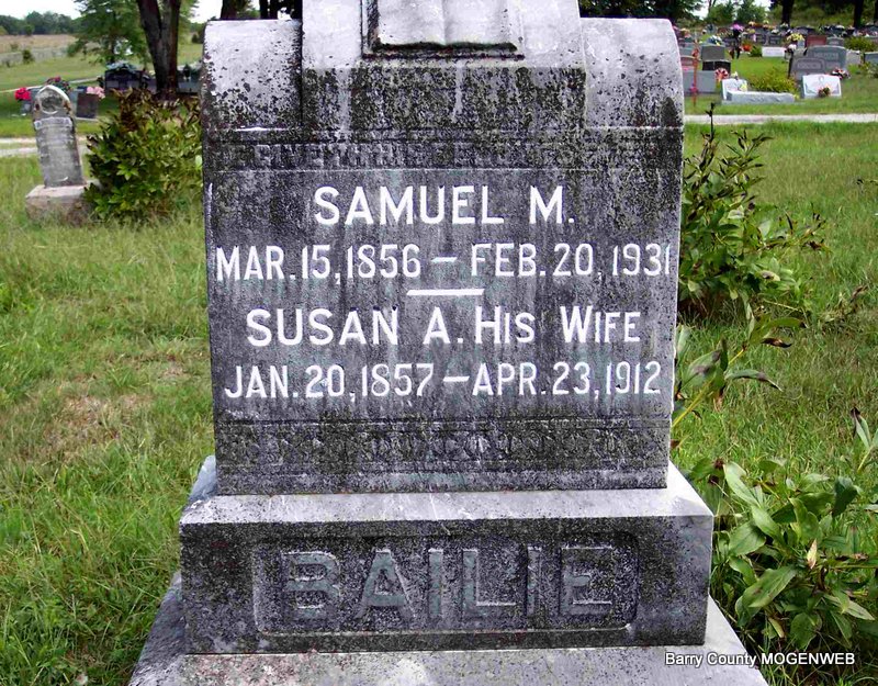 SSW: Samuel M. - Research Note: Wife of Samuel M. Bailie, Jr.- Her death certificate reads that her parents were John and Susan Redding, born KY. It has her birth as Apr. 1857, which may be incorrect. She died of TB. Noah Bailie of Clio, MO was the informant on the death certificate. - Cassville Republican, May 1912 - Clio News: April 30, the death angel visited our community and claimed for its victim the wife of Samuel Bailie. She was a victim of consumption, was sick four months. She bore her sickness with patience, waiting for the end to come. Susan was 55 years old joined the M. E. Church when very young and remained faithful until death. She leaves a husband, five sons and two daughters to mourn her loss. The funeral was conducted by Rev. Ennes of near Cassville after which she was laid to rest in the Zion Cemetery to await the resurrection morn. | Family Records Death Certificate Frances Albert Online Obit Phyllis Long Photo Diana Cope |