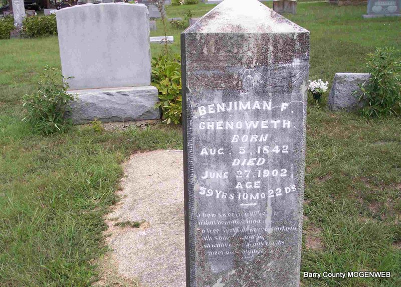 Inscription: "Aged 59 Yrs, 10 Mo, 22 Ds" - Research Note: Jack Heffron notes from findagrave.com: Benjamin was in the Civil War. Him and his 3 brothers joined at the same time, July 4, 1862. Benjimin was assigned to Co. F, 70th Reg. Ill. Volunteer Infantry, 20 yrs old. He took a severe cold, from exposure as they camped without tents or blankets, he was to have eye afflictions the rest of his life. He mustered out on Oct. 23, 1862. In 1900 he lived in Mountain, Barry Mo., with his Wife Nancy E., three boys, John William, George Edgar, David Hiram, and John W. Palmer, Nancy's Father. David married Rossana. George married Cora P. King, in Cassville, Barry Mo., Dec. 12, 1900. Benjamin died and all the family moved to Oklahoma. Benjimin's family are all buried in Hinton cemetery, Hinton, OK, including Oscar Doty and John W. Palmer, except David and Rosanna they are buried in Wheatland Ok. Oh! I forgot Earl F. Chenoweth, George and Cora's first born, he was born in Cassville, Barry MO Oct. 17, 1901, died 1958 In Mobile Alabama. - Benjimin was the son of Luke Chenoweth and Mary A. McElwain. His wife was Nancy Palmer. After George's death, she went to live with son John William in OK and died there. | findagrave.com Phyllis Long Photo Diana Cope |
